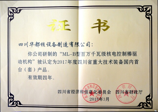 “ML-B型控制棒驱动机构”被认定为四川省重大装备国内首台(套)产品