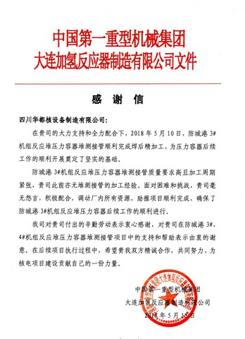 5月15日,华都公司收到中国一重集团大连加氢反应器制造有限公司发来的感谢信,信中说:在贵司的大力支持和全力配合下,2018年5月10日防