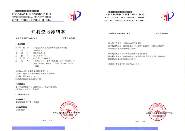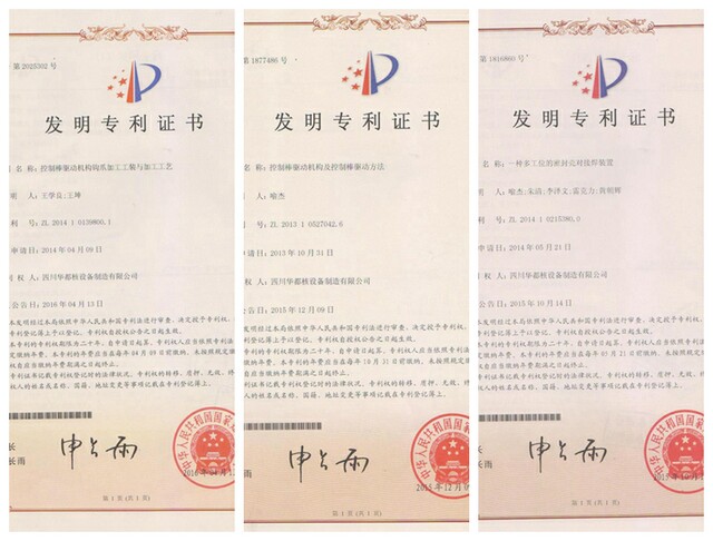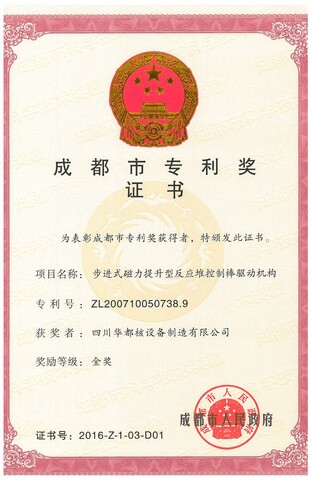 公司拥有ML-B型、ML-C型控制棒驱动机构等一批核心发明专利,拥有各类控制棒驱动机构等核设备相关技术专利70余项,其中步进式磁力提升型反应堆控制棒驱动机构专利于2017年荣获成都市专利发明金奖。